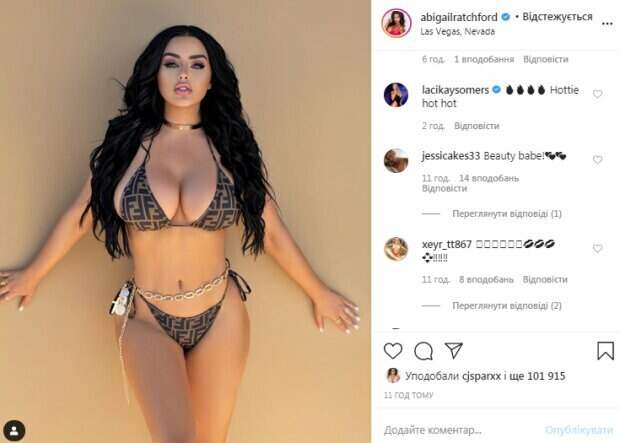 "Думаю о числе от 1 до 100. Победитель получает ответ. Готовый набор очень крутых кроссовок", - написала Эби. Фанаты поставили почти 100 тысяч лайков и написали комментарии: "Прекрасно", "Чертовски красивая", "Gorgeous", "Это платье выглядит потрясающе", "А где трусики?", "Кто нибуть тебе говорил, Эби, что ты выглядишь, как молодая Мари Осмонд?", "Красивая женщина". Сообщалось, что популярная американская модель Эбигейл Рэтчфорд сверкнула роскошной фигурой в купальнике. Девушка надела мини-бикини, которое едва прикрыло ее необъятную грудь. Пышное сокровище модели буквально вываливалось из маленьких клаптиков ткани. Маленькие трусики прикрыли все лишнее, сделав отличный акцент на тонкой талии Эбигейл. Образ дополнил яркий макияж и красиво уложенные волосы. Ранее мы сообщали, что мериканская супермодель Эбигейл Рэтчфорд похвасталась большим бюстом в маленьком купальнике. Модель позировала в распахнутой рубашке с принтом морской тематики. Под одеждой звезда предстала в золотом бикини, ткань которого натянулась на большой груди. Объемы "налились" и их с трудом сдерживал маленький купальник. Напомним, модель Эбигейл Рэтчфорд невинно поиграла огромным бюстом в мини-бикини А еще Politeka писала, что Эби Рэтчфорд в чулках и белье выгнулась и показала нереальные размеры Также Politeka сообщала, что горячая Эби Рэтчфорд на каблуках избавилась от белья и задрала ноги