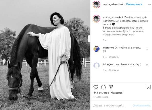 Девушка выбрала необычный наряд ради этого фото: на ней было длинное светлое платье, напоминающее сорочку. Слегка растрепанная Адамчук устремила задумчивый взгляд в сторону. От этого чувственного снимка мурашки по коже. В подписи к черно-белому кадру говорится: "События последних дней учит меня простой истине: сила в спокойствии 🖤 Желаю вам хорошего сна, после которого утром вы будете наполнены продуктивной енергией🕊" Несколко пользователей успели прокомментировать: "Ой чей то конь стоит .. (с)"; "и вам хорошего дня :)". Ранее мы сообщали, Марта изумила фото, на котором позировала в персиковом костюме. Звезда "Квартала" произвела фурор, сняв пиджак и оставшись в одном черном лифчике. Девушка сидела в кресле и соблазнительно изогнулась, запрокинув руку за голову. Яркий макияж и минимум украшений дополнили ее роскошный образ. "И что она себе думает?)", - подписала фото звезда. Пользователи кинулись обсуждать увиденное, засыпав Марту комплиментами в комментариях: "Марта, ты ли это?))"; "Яка ти гарна❤️"; "Сказочная ))))😊😊😊"; "Романтично закохана красуня💗"; "Неймовірна!😍". Кроме того, мы рассказывали, что Адамчук продемонстрировала красоту, показав лицо крупным планом. Знаменитость позировала с аккуратной укладкой, легким макияжем с акцентом на выразительные карие глаза, а также с изящными украшениями - сережками с крупным камнем и такой же подвеской. Напомним, знойная брюнетка из «Квартал 95» свела с ума ярким образом с пикантной деталью: «Обворожительная». Как сообщала Politeka, счастливая Кекелия после родов прыгнула с мужем в постель, видео: "Раньше падали в лепестки роз, а теперь..." Также Politeka писала, что роскошная брюнетка из "Квартал 95" поразила ангельским образом.
