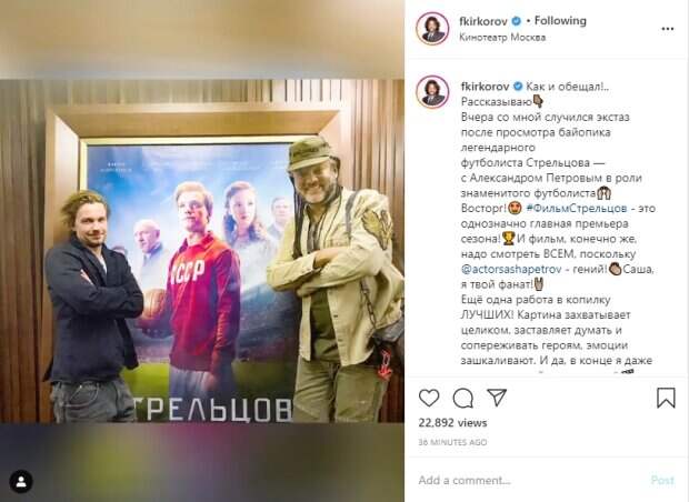 "Вчера со мной случился экстаз после просмотра байопика легендарного футболиста Стрельцова — с Александром Петровым в роли знаменитого футболиста