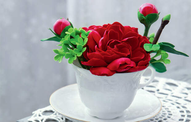 Слепите пышный пион, пару бутонов, листиков и поместите получившийся букет в чашку. Всего полчаса работы – и эффектное интерьерное украшение готово! ВАМ ПОНАДОБИТСЯ: полимерная глина ClayCraft by Deco(белая, красная, зеленая и коричневая) флористическая проволока фарфоровая чашка акриловая гуашь зеленая кисть синтетическая ножницы клей ПВА молд для листьев пенопласт или флористическая губка ШАГ 1 Смешайте белую […] Запись Король всех цветов: пион из глины впервые появилась ФОКУС ВНИМАНИЯ.