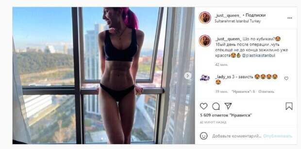 Этот раз не стал исключением, ведь Анастасия опубликовала фото, где в топе и стрингах стояла у окна. Девушка согнула ножку, демонстрируя идеальный животик. Красотка позировала у просторного окна с видом на высотки мегаполиса. "Что по кубикам? 18-ый день после операции ,чуть отёк,ещё не до конца зажили,но уже красота", - написала Анастасия под фото. Фанаты поставили тысячи лайков и написали комментарии: "З - зависть", "Как будто ты сидела в спортзале минимум полгода", "Красиво очень", "Нереальная", "А самим накачать, не?", "Черт, ну видно что это не мышцы, которые сама накачала". Мы писали, что скуластая украинская блогерша Анастасии Покрещук эффектно выпятила переделанную пятую точку. На фото блогерша попозировал стоя возле окна в черных трусиках-бикини и топе, выпятив свою пятую точку. "Как вам мой орех? 17 дней операции( липосакция и липофиллинг) Обожаю", - написала Покрещук. Напомним, звезда "Від пацанки до панянки" Покрещук устроила сеанс соблазна в кровати Также Politeka сообщала, что звезда "Від пацанки до панянки" Покрещук показалась в одном белье после новой операции А еще Politeka писала, что звезда "Від пацанки до панянки" Покрещук после новой операции поразила безупречным телом
