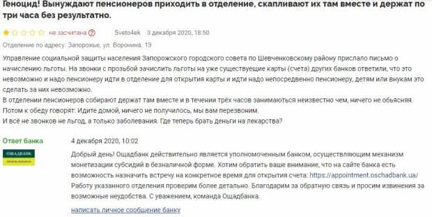 "На звонки с просьбой зачислить льготы на уже существующие карты других банков ответили, что это невозможно и надо пенсионеру идти в отделение для открытия карты, и идти надо непосредвенно пенсионеру, детям или внукам это сделать за них невозможно. В отделении пенсионеров собирают, держат там вместе и в течении трёх часов занимаються неизвестно чем, ничего не обьясняя. Потом к обеду говорят: Идите домой, ничего не получилось, мы вам перезвоним. И всё, не звонков не льгот, а только заболевания. Где теперь брать деньги на лекарства?", - задается она вопросом в своем отзыве. "Ощадбанк действительно является уполномоченным банком, осуществляющим механизм монетизации субсидий в безналичной форме. Хотим обратить ваше внимание, что на сайте банка есть возможность назначить встречу на конкретное время для открытия счета.. Благодарим за обратную связь и просим извинения за возможные неудобства. С уважением, команда Ощадбанка", - оперативно ответил на жалобу представитель банка. Клиента уже в комментариях спросила, почему сотрудники отделения заранее не открыли социальную карту, поскольку она приносила необходимые для этого документы. "Почему не открыли социальную карту сотрудники банка? Паспорт и ИНН были предьявленны (на всякий случай принесенны ксерокопии) Почему не перезвонили?.. В мае никкто не оповещал о деньгах, про эти деньги ни слуху не духу небыло. Да и деньгами это назвать стыдно, (полтора кг мяса) Зачем мурыжить людей?", - задалась она еще раз несколькими вопросами, пытаясь достучаться до Ощадбанка. Напомним, Ощадбанк отказывает в закрытии банковских карт и блокирует денежные переводы Как сообщала Politeka, Ощадбанк отказывает в закрытии банковских карт и блокирует денежные переводы Также Politeka писала, что Массовая блокировка карт "Ощадбанка", украинцы остаются без пенсий и соцвыплат