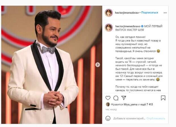 В новой публикации Эктор показал, как выглядел 10 лет, во время первого сезона "Мастер Шеф". Также Хименес-Браво добавил современного себя, чтобы фанаты могли сравнить. "МОЙ ПЕРВЫЙ ВЫПУСК МАСТЕР ШЕФ Ох, как сегодня помню! Я тогда уже был известным поваром в нашем кулинарном мире, но совершенно неопытный на телевиденье. Я очень стеснялся", - написал Эктор. Пользователи Инстаграм поставили более 7 тысяч лайков и написали комментарии: "Голос у вас, кстати, очень приятный", "Вы ,как дорогое вино с годами только интереснее и лучше становитесь", "Шикарный мужчина", "Такой красивый", "Помню первые выпуски, как мне нравились выездные конкурсы". Напомним, ресторатор Эктор Хименес-Браво, уехавший из страны, засветился на митинге А еще Politeka сообщала, что довольный Хименес-Браво решился рассказать о своей подружке Также Politeka писала, что Каменских спровоцировала Эктора Хименес-Браво, таким звезду "Мастер Шеф" еще не видели