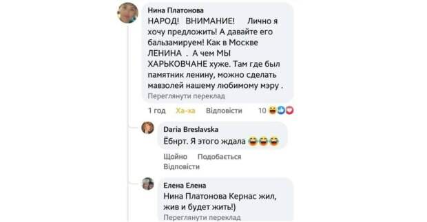 "Можно сделать мавзолей нашему любимому мэру", - предложила харьковчанка. "Забальзамируй и дома у себя положи", "хорошая идея ", "Вам бы в дурку, вместе с идолом", "Хорошая идея! Иди малая переодевайся и вали домой, ты проиграла в этой жизни", "можно на лавочке его положить, красиво будет", "... Но дело его живёт...", "Может давай его на крест повесим и сожжем, как Иисуса Христа? Чем мы хуже?", "Ну хоть кто-то додумался. Хорошая же мысль", "Лучшая идея которую я слышал, хах", "И лавочек побольше у мавзолея надо поставить", - шутили в комментариях харьковчане. Ранее мы писали, что 21 декабря в Харькове приземлился самолет из Берлина с телом Геннадия Кернеса Спустя полчаса после приземления борта катафалк и автомобили охраны выехали с территории летного поля. Чартерный самолет из Берлина приземлился в аэропорту Харькова. После необходимых процедур, гроб с телом погрузили в катафалк прямо на взлетном поле. В сопровождении кортежа, авто покинуло территорию аэропорта. Тело доставили в морг 17-й городской больницы. Встречать самолет в аэропорт прибыли городские чиновники, в частности, секретарь горсовета Игорь Терехов и экс-глава Харьковского областного совета Сергей Чернов. "Очень тяжело детям и жене. Тяжелая утрата и для семьи и для нас всех. Мы одна большая дружная семья, которую Геннадий Адольфович формировал не один год", — сказал в аэропорту Игорь Терехов. К слову, в Харькове объявили трехдневный траур, жители негодуют из-за ограничений: "Мало нам карантина?". Как сообщала Politeka, Добкин заговорил об участии в выборах после трагедии с Кернесом: "Было бы верхом кощунства...". Также Politeka писала о том, кто возглавит Харьков после трагедии с Кернесом, детали: "Не факт, что выборы скоро состоятся".