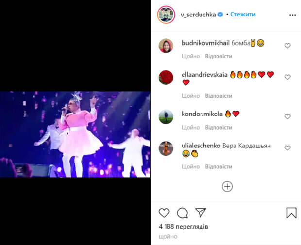 Верка была одета в розовый обтягивающий свитер и пышную юбку из фатина. Артистка устроила традиционные пляски на сцене со своим балетом. «VERKA SERDUCHKA - #switter. Live @ #YUNAAWARDS 2013», - подписала Сердючка видео. Стоит отметить, что перед выступлением Сердючку громко объявил Потап, который аж завопил от восторга. В комментариях преданные поклонники оставили звезде массу приятных слов. «Шедевр!», «Обожаю», «Мне кажется, что знаю тебя всю жизнь», «Класс», «Вера Кардашьян», «Как всегда поднял настроение! Спасибо Андрей!», «Такая эпоха была, ну почему же в этом духе не продолжать писать песни и исполнять? Ведь всем миром любимы. Я из США», - пишут пользователи сети. Как известно, сейчас Андрей Данилко довольно редко выступает на сцене, предпочитая появляться в качестве судьи на разных телепроектах. Однако, певец активно выступает на корпоративах. Например, осенью 2020 года Сердючка зажигала на свадьбе Владимира Остапчука. Напомним, что неугомонная мама Сердючки с бутылкой ошарашила дерзкой выходкой на сцене: «Ностальгируем, Верочка…». Как сообщала Politeka, Данилко обзавелся новой квартирой в знаменитой киевской высотке: "Стоимость таких апартаментов...". Также сообщалось, что Верка Сердючка и Геля появились вместе и вызвали фурор, яркие кадры: "Я хотела сделать сюрприз. ..".