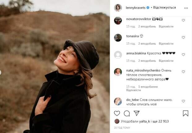 Коли втомишся всіх зігрівати нас, сонце, Просто раптом в подушки-хмари сховайся... Загорнись у вітри свої — теплі ковдри... Поридай там дощем, не скажу я нікому. Вилий душу всю небу й морю, сонце. Охолонь, відпочинь від всіх нас наодинці. Я сховаюсь під зонт, почекаю на тебе, відпущу свої сльози, з твоїми змішаю... Не соромся бути собою, сонце, Не зважай, що люди говорять про тебе. То їм мало тебе, то ти дуже гаряче. Та не зможе без тебе — ні земля, ані небо.. В Сети активно комментируют пост Кравец. «Боже, как красиво», «Класс, с душой», «Очень сильно», «Лена что за печаль?у тебя есть семья деньги успех и вот вдруг сидишь по среди поля и тут грусть тучи