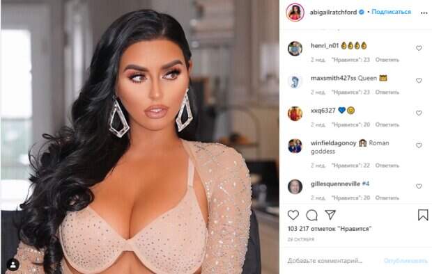 Рэтчфорд не стала рекламировать одежду, сосредоточившись на теме нижнего белья. Поэтому в Инстаграм Эби можно найти лишь пикантные и открытые кадры, которые демонстрируют ее фигуру во всей красе. На одном из таких фото модель позировала в бежевом костюме с блестками, причем на бюсте видно, что лифчик с трудном скрывает ее достоинства и явно маловат размером. Неизменный яркий макияж был сделан со специальным акцентом на пухлые губы, а черные локоны уложены в привычную прическу без шпилек. Вот как реагируют в сети: «Летнее время