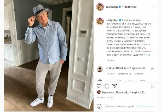 Артист улыбался, взявшись за краешек головного убора. А в тексте он рассуждал о свободе. Примечательно, что рэпер позировал без своей жены, певицы Насти Каменских. "Сила хорошего настроения! Я знаю людей, которые не допускают мысли о том, что можно расслабиться и получать удовольствие от жизни на всю! Тут важно понять, что значит «на всю», ведь «Всю» у каждого разное ! Позвольте себе не на всю, а почти на всю, разрешите себе побыть свободными, побыть собой, больше чем обычно! Не благодарите!", - написал Потап. Почти за час публикация собрала более 4000 лайков и много комментариев. "Какой красавец