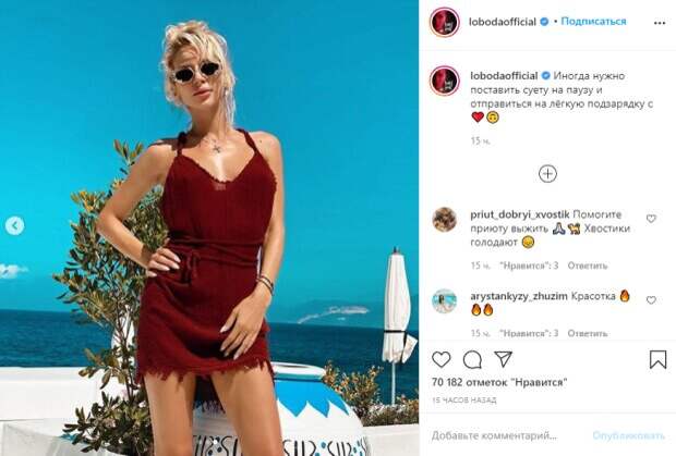 Так, певица примерила коротенькое красное платье на тонких лямках с поясом в тон наряду. При этом позировала Светлана без белья, что сразу отметили пользователи. Образ Лободы дополнили солнцезащитные очки и простая укладка белокурых локонов. «Иногда нужно поставить суету на паузу и отправиться на лёгкую подзарядку с ❤️🙃», - написала Лобода. Вот как отреагировали пользователи: «Красотка 🔥🔥🔥», «Кайфы кайфуем», «Прекрасна 🌹», «Как скажешь😋», «Да вы сами подзарядите кого хотите😁», «Так и есть, верные слова 👍😘🤗😘», «какая прекрасная😻❤🔥», «Вауу красотка 🔥🔥❤», «По стечению обстоятельств я как раз вашу песню слушаю❤️❤️🔥», «Ох., как вам идёт это платьице! Очень ., цвет – охренительный», «со*ки шикарно торчат», «Горяча и бешенна🔥❤️». Также загорелая певица в коротеньком черном топе и ярко-оранжевых шортах повеселилась в зале. Артистка показала результаты тренировок перед зеркалом. При этом удивила удивительно подтянутыми ножками, на которых шорты выглядят даже несколько большими. С распущенными светлыми волосами Светлана выглядела по-домашнему. Как известно, артистка тренируется практически каждый день и даже в отпуске не забывает про разминку, растяжку и множественные упражнения на бедра и ягодицы. «Моя диета – это всякое отсутствие диет. Я знаю, что необходимо есть минимум пять раз в день маленькими порциями. Тренер говорит, что я должна возить с собой судочки, чтобы получать после тренировок нужный объем белков. Но с моим графиком, честно говоря, не до судочков», - говорила Светлана. Певицу часто сравнивают с другими похудевшими звездами, в том числе и Каменских, отмечая, что им следует поучиться мотивации Светланы. Напомним, что Лобода одним видео довела поклонников до истерики, превратившись в готическую диву. А еще Politeka писала, что Лобода не сдержалась и устроила горячие поцелуи с девушкой на пляже. Также Politeka сообщала, что пышногрудая Лобода в откровенном топе произвела фурор, выбрав самый горячий ракурс: кадры
