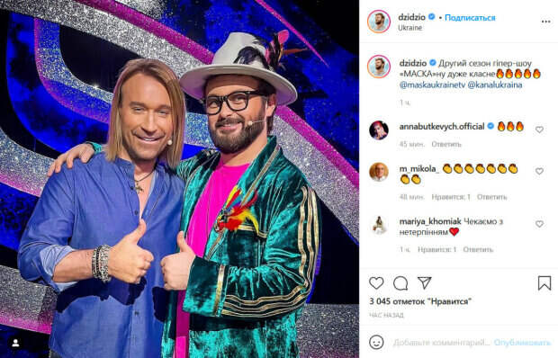 На фоне этих новостей звездные судьи проекта также оживились в соцсетях. Напомним, что их состав в этом сезоне не изменится: угадывать личности участников будут Настя Каменских, Олег Винник, Оля Полякова, Дзидзьо и Андрей Данилко. Как сообщает Politeka.net, первыми эмоциями от предстоящего сезона поделился в Инстаграм Дзидзьо. «Второй сезон гипер-шоу «Маска» ну очень классное», - написал он. На новом фото певец позирует на съемочной площадке, приобнимая за плечи своего коллегу Олега Винника. При этом Дзидзьо одет в яркий бирюзовый костюм, а Винник – в простую синюю рубашку. Поклонники артистов не смогли пройти мимо. «Ждем с нетерпением», «Лучшие мужчины государства», «Круто», «Огонь», - пишут люди. Напомним, Винник возвращается на ТВ, кем стал повелитель "волчиц". Как сообщала Politeka, Каменских вдали от Потапа засняли в обществе Дзидзьо. Также Politeka писала, что новый сезон шоу "Маска", стало известно, как Данилко заманили в жюри.