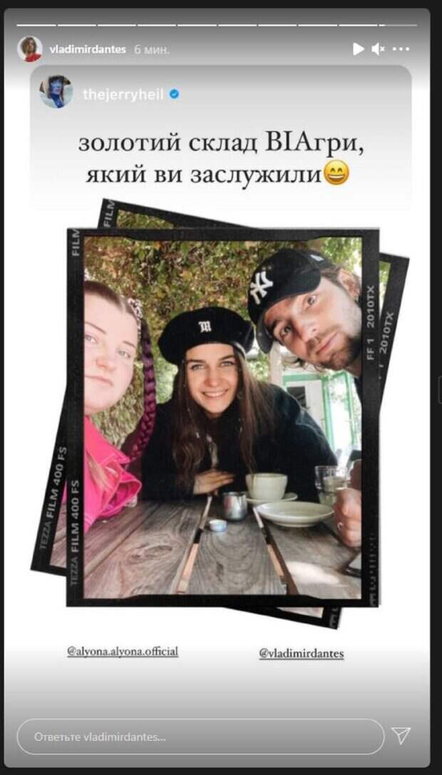 В этот раз Владимир опубликовал фотографию, на которой был вместе с певицей Jerry Heil, известной по песне "Охрана - отмена", а также рэп-исполнительницей Alyona Alyona, у которой не так давно начались проблемы с законом из-за дрифта на Софиевской площади в Киеве. Все трое были за деревянным столом, смотря в камеру. Фотографию опубликовала Jerry Heil, сделав подпись: "Золотой состав ВИА Гры, который вы заслужили". Владимир Дантес же перепостил данный кадр в Инстаграм, никак дополнительно не подписывая его. Напомним, муж Дорофеевой Дантес рассказал о привычках во время сна, украинцы не выдержали А еще Politeka писала, что муж Дорофеевой Дантес поиздевался над Кошевым и Ткачом из "Квартал 95" Также Politeka сообщала, что Квартал 95 рассекретил нового ведущего "Рассмеши комика", и это не Ласточкин