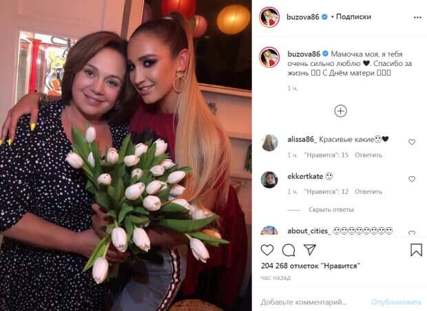 "Мамочка моя, я тебя очень сильно люблю. Спасибо за жизнь. С Днем матери", - написала она. Следует отметить, что маму Бузовой зовут Ирина. Весной следующего года женщине исполняется 60 лет, она работает заместителем главного врача в стоматологической клинике Санкт-Петербурга. В последнее время мама артистки активно появляется на совместных снимках и видеороликах своей популярной дочери. Пользователи соцсети присоединились к поздравлениям и отметили, что мама Бузовой прекрасно выглядит. "Самая красивая мамочка", "На маму похожа", "Очень красивые! Здоровья твоей маме!", "Мама красивая!", "Какая у вас красивая мама! Красавицы! С праздником мам вас!", "Мамочка шикарная", "Такие милые", "Оленька, вы такие с мамой капельки. На наших мамах, как на пуговицах, все держится", - пишут в комментариях. Напомним, что счастливая Бузова не сдержала эмоций, запрыгнув на руки к звездному красавцу: "Оля это заслужила...". А еще Politeka писала, что Бузова в синяках и с конским хвостом ошеломила видом, редкое фото в платье: "ужасное..." Также Politeka сообщала, что высокомерная Бузова после провала на росТВ разразилась откровениями: "не хочется ничего говорить...".