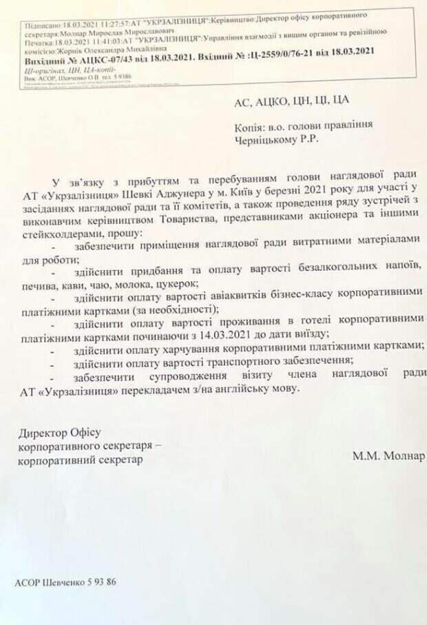 Визит Шевки Аджунера, который прилетал в марте в Украину, сопровождал специальный корпоративный секретарь. Аджунеру оплатили проживание, перелет, а также передвижения по городу. Соответствующие документы опубликовал на своей страничке в Фейсбуке экс-нардеп Борислав Береза. Согласно этому документу, в марте этого года секретарь запросил у УЗ средства, которые должны были перечислить на корпоративную карту Шевки Аджунера – на проживание, питание и передвижение по городу.