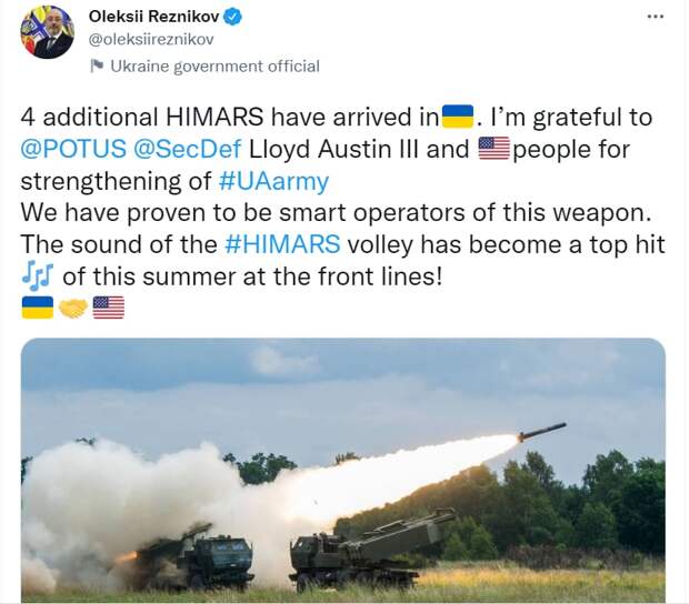 Киеву передали ещё четыре американские системы РСЗО «Хаймарс», которые якобы кардинально меняют обстановку на фронте. Об этом в своём твиттере сообщил министр обороны Украины Алексей Резников, передаёт корреспондент «ПолитНавигатора».