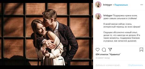 Возлюбленная украинского шоумена и ведущего Владимира Остапчука Кристина Горняк поделилась романтичным фото с артистом и раскрыла подробности их отношений Новый пост Кристина опубликовала в своем Инстаграм. Об этом пишет Politeka.net. Так, девушка рассказала о том, что всем людям нужна поддержка, а у нее в жизни сейчас такой период, когда она важна как никогда.