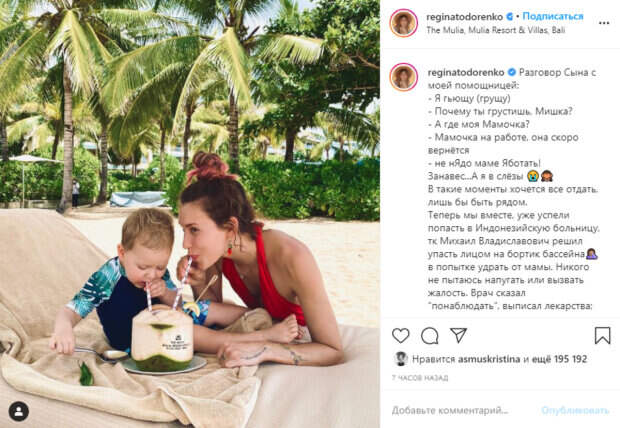 Телеведущая и певица Регина Тодоренко заставила публику переживать Как передает Politeka.net, 30-летняя звезда опубликовала свежее фото в своем микроблоге в Инстаграм, на котором предстала вместе с 2-летним сыном Майклом. Девушка сейчас отдыхает с наследником в Индонезии. На снимке они с малышом расположились на шезлонге, попивая коктейль из кокосового ореха.