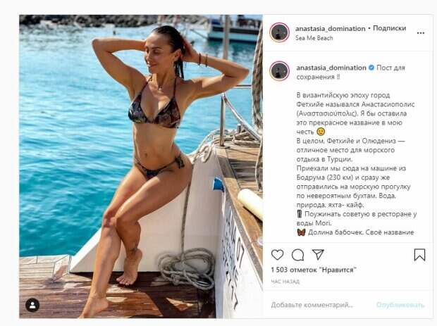 Об этом пишет Politeka.net со ссылкой на страничку красавицы. "В византийскую эпоху город Фетхийе назывался Анастасиополис (Αναστασιούπολις). Я бы оставила это прекрасное название в мою честь. В целом, Фетхийе и Олюдениз — отличное место для морского отдыха в Турции. Приехали мы сюда на машине из Бодрума (230 км) и сразу же отправились на морскую прогулку по невероятным бухтам. Вода, природа, яхта- кайф", - написала Кумейко. Фанаты поставили полторы тысячи лайков и написали комментарии: "Ну это любовь", "Шикарная самочка", "Ну что тут скажешь, красива.....", - отмечают люди под фотографией красавицы. Сообщалось, что экс-певица группы Nikita Анастасия Кумейко впечатлила необычным телом в горячем купальнике. На фото Кумейко позирует на залитом солнце живописном дворике. На ней черный слитный купальник с оригинальной окантовкой, небрежно повязанная сверху белая рубашка и черные очки. Напомним, горячая экс-Nikita отличилась неожиданной выходкой во время безбашенного танца А еще Politeka писала, что экс-Nikita в купальнике дерзко присела на корточки, засветив самое сочное Также Politeka сообщала, что экс-Nikita в крохотном купальнике посветила роскошными «близняшками»