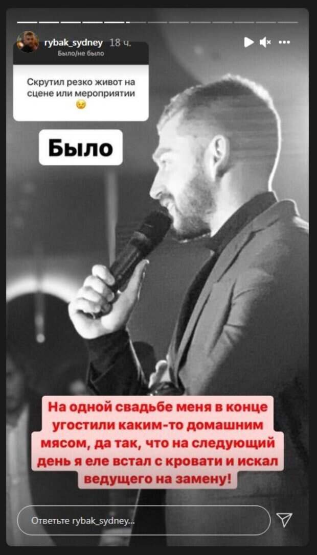 Андрей Рыбак стал активнее развивать карьеру юмориста, а также свои аккаунты в Инстаграм и Ютуб. Также бывший участник "Холостячки" продолжает вести различные мероприятия. В частности, нередко Рыбак становится ведущим на свадьбах. В своем стори Рыбак рассказал о неприятном случае на торжестве. "Скрутил резко живот на сцене или мероприятии?", - поинтересовался один из подписчиков. "Было", - написал Рыбак, и добавил о кошмаре, который его ждал: "На одной свадьбе меня в конце угостили каким-то домашним мясом, да так, что на следующий день я еле встал с кровати и искал ведущего на замену!". Также ведущий рассказал об еще одной неприятной ситуации. Оказывается, он стал жертвой мошенников, и назвал им данные своей карты. "Там немного уменя было!Где-то 3000 грн! Но все равно обидно", - поделился экс-участник "Холостячки". Напомним, что экс-кавалера Мишиной жестко высмеяли в сети за роль в сериале Как сообщала Politeka, Рыбак из "Холостячки" засветился со своей избранницей Также Politeka писала, что Рыбак из "Холостячки" показал кадры с места жуткого ДТП и обратился к украинцам