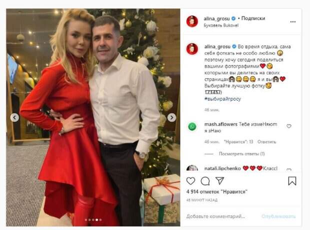 На одном из последних кадров Алина уже стояла в красном платье. Девушка позволила мужчине в рубашке и штанах обнять себя за талию, позируя у новогодней елки. "Во время отдыха, сама себя фоткать не особо люблю, поэтому хочу сегодня поделиться вашими фотографиями, которыми вы делитесь на своих страницах, я и вы. Выбирайте лучшую фотку", - написала звезда. В комментариях появилась реклама странички инстаграм: "Тебе изменяют, я знаю". Гросу сразу решила ответить на это утверждение: "родители - да, они теперь немножко больше любят младшего брата, но им можно. А теперь с этой рекламой вон с моей страницы". Сообщалось, что украинская певица и актриса Алина Гросу весело проводит новогодние праздники на горнолыжном курорте в Карпатах. Красотка сделала селфи на фоне гор, нарядившись в теплую куртку черно-белой камуфляжной расцветки и простую шапку, в руках у нее можно заметить карточку с надписью "Буковель". Напомним, раздобревшая Алина Гросу наделала шуму появлением в латексном костюме Также Politeka писала, что игривая Алина Гросу с младенцем на руках ошарашила признанием Также Politeka сообщала, что игривая Алина Гросу без труда соблазнила молодого красавца, даже сама удивилась