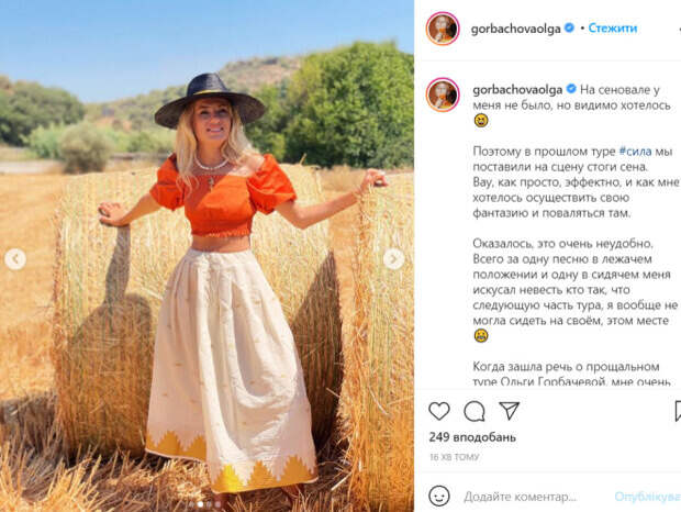 Поэтому в прошлом туре #сила мы поставили на сцену стоги сена. Вау, как просто, эффектно, и как мне хотелось осуществить свою фантазию и поваляться там», - призналась певица. По словам артистки, на деле это оказалось очень неудобно, поскольку за одну песню ее успели искусать насекомые. Горбачева отметила, что для своего прощального тура она хотела повторить программу силы, но декорации с сеновалами ее больше не впечатляют. Ольга также обратилась к поклонникам с просьбой рассказать об их любимых песнях, чтобы она могла исполнить их на своих последних концертах. Напомним, что Ольга Горбачева в миниатюрном купальнике ошеломила фигурой после 40: "Утрете нос двадцатилетним". А еще Politeka писала, что Ольга Горбачева удивила разнообразием образов с одним платьем: "Если не увидите разницы...". Также Politeka сообщала, что Ольга Горбачева в леопардовом купальнике похвасталась стройной фигурой: «Не дашь 40».