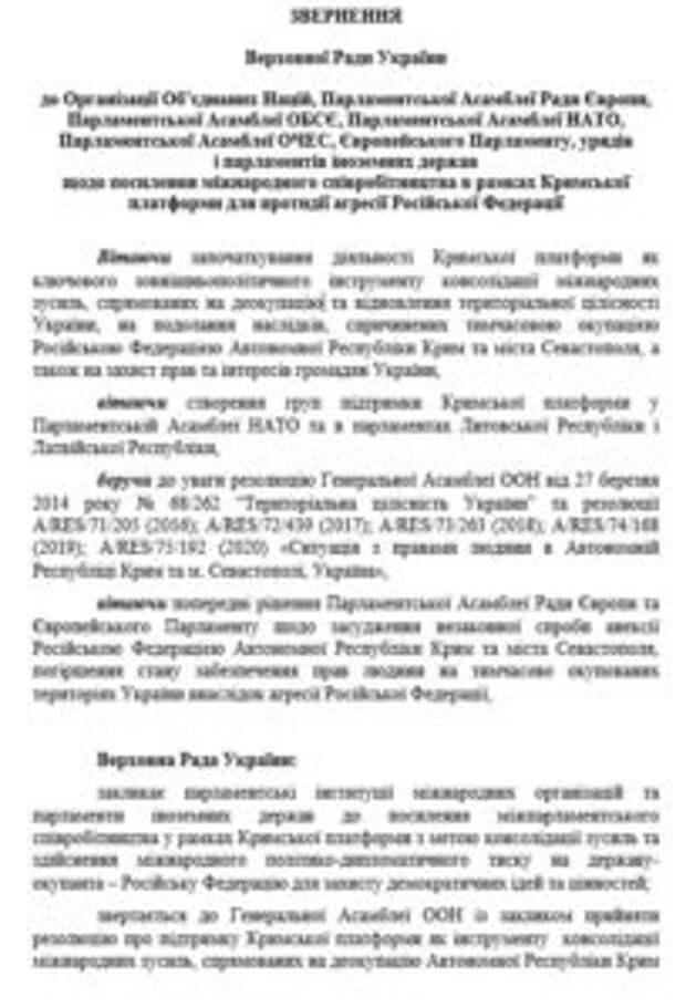 Последним аккордом, прошедшей сегодня в Киеве Крымской платформы стало внеочередное заседание Верховной Рады с участием гостей саммита. В частности, нардепы проголосовали проект постановления по Крымской платформе. Его название звучит так: «Об Обращении Верховной Рады Украины к Организации Объединенных Наций, Парламентской Ассамблее Совета Европы, Парламентской Ассамблее ОБСЕ, Парламентской Ассамблее НАТО, Парламентской Ассамблее ОЧЭС, Европейскому парламенту, правительствам и парламентам иностранных государств по усилению международного сотрудничества в рамках Крымской платформы для противодействия агрессии Российской Федерации».