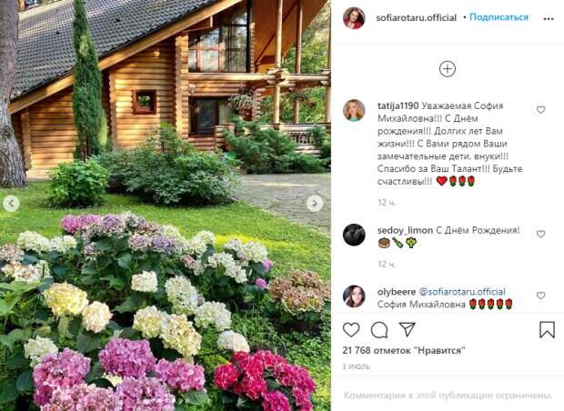 А сегодня, после дня рождения звезды, в сети, на фан-странице Ротару в Инстаграм, появились кадры с того же дома, где звезда отметила свой счастливый праздник. Поздравить звезду приехали близкие, среди которых была замечена и внучка Ротару – Соня. «Уважаемая София Михайловна!!! С Днём рождения!!! Долгих лет Вам жизни!!! С Вами рядом Ваши замечательные дети, внуки!!! Спасибо за Ваш Талант!!! Будьте счастливы!!! ❤️🌹🌹🌹», «Поздравляю Вас! Где взять мне силы, чтоб забыть про Вас 😉 Пойду искать, чтобы найти! До встречи) Вы так прекрасны, как цветы: как лилии нежны, как розы нежно пахнете)», «! Здоровья от счастья, любви! Творческого долголетия! Поклонников и 1000 искренних поздравлений!!!😍❤️🌹», «София, с Днём рождения Вас💞💞💞 🌹 красота человеческой души отражается во всей окружающей атмосфере... бесконечно можно смотреть на вашу улыбку, глаза и мир вокруг вас играет миллионами красок, мелодий и цветов.... Долгих лет жизни, благополучия, мира и любви!🌹🌹🌹», - пишут восхищенные пользователи в ответ. Также мы писали, что личный фотограф Аллы Пугачевой Роман Родин поздравил Софию Ротару с днем рождения, поделившись ее редким архивным фото. На фото тогда еще молодая Ротару позирует в Кремле с бокалом напитка в одной руке и охапкой цветов – в другой. Можно предположить, что снимок был сделан во время участия звезды в «Песне года». «Несравненная София! С днём рождения!», - подписал снимок фотограф. На еще одном фото, опубликованном Родиным, можно увидеть Ротару с немного другого ракурса, в котором она практически не похожа на себя сейчас. Тогда звезда предпочитала более заметный макияж с крупными черными стрелками и красной помадой, а ее образ дополняла челка. Напомним, довольный Киркоров забыл о Пугачевой, страстно прижав к себе Софию Ротару. Как сообщала Politeka, архивные фото юной Софии Ротару слили в сеть, певицу в юности не узнать: "Ничего себе". Также Politeka писала, что избалованная София Ротару повысила гонорары в разгар эпидемии: "Мало платите, давайте...".