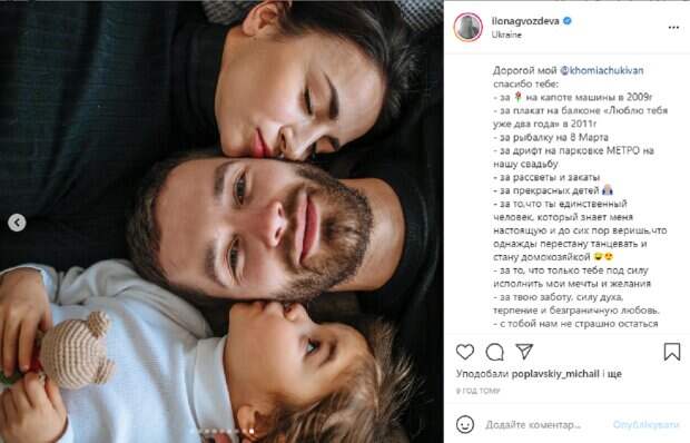 На снимках можно увидеть и саму Илону с семьей, но больше всего кадров, где ее муж Иван Хомячук с детьми. Видно, что мужчина участвует в жизни детей и весело проводит с ними время. Эти фото растрогали всех фанатов Илоны, но еще больше трепетное поздравление, которое она оставила мужу в соцсети. В подпсии к фотографиям Гвоздева написала благодарность красавчику-мужу, выдав некоторые подробности их совместной жизни. Так, среди прочего хореограф призналась, что ее муж мечтает о моменте, когда она оставит танцы и станет домохозяйкой. "Сегодня день Отца… В слове 4 Буквы, но как много они значат в нашей жизни! Ты лучший муж и самый лучший отец. Любим и ценим тебя. Твоя семья. Не забудьте девочки поздравить своих пап и мужей", - написала Илона и добавила кучу благодарностей мужу. Напомним, Победительница "Танців з зірками" Гвоздева заговорила о знаках судьбы: "Всегда обращаю внимание…". Как сообщала Politeka, Победительница "Танців з зірками" Гвоздева в золотом платье произвела фурор на премии Viva: "Получила массу комплиментов". Также Politeka писала, Победительница "Танців з зірками" Гвоздева растрогала кадрами с красавчиком-мужем и детьми: "Мои родные".
