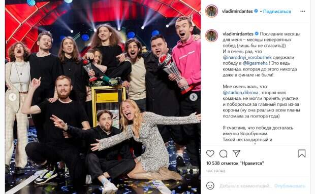 В своем посте певец выразил свои эмоции в связи с этим событием. «Последние месяцы для меня – месяцы невероятных побед (лишь бы не сглазить))) И я очень рад, что «Воробушек» одержали победу в «Лиге смеха»!.. Я счастлив, что победа досталась именно Воробушкам. Такой нестандартный и неклассический юмор только набирает обороты у нас, и я супер рад что вы оценили его по достоинству», - написал Дантес. Он поблагодарил всех, кто голосовал за его команду. Отдельно он обратился к самим юмористам, подчеркнув, что ему с ними всегда весело. Певец также поделился кадрами с финального выпуска шоу. На одном из них Дантес закрывает лицо рукой, будто стараясь спрятать слезы. Отметим, что это не единственная победа певца за последнее время: не так давно он также стал победителем шоу «Липсинк баттл». В комментариях к посту Дантеса отметилась Маша Ефросинина, которая также участвовала в «Лиге смеха». «А я счастлива, что попала с тобой в этот сезон. С первого дня ты мой самый крутой проводник! А победы только начинаются! Хотя да, ты немного неприятный мужчина за последние две недели», - написала ведущая. Поклонники Дантеса также отметились под постом. «Спасибо тебе крутой харьковчанин! Надеюсь мы ещё не одну победу отметим на корабле», «ничего бы не было без тебя», «Вова вы тоже заслужили эту победу. Вы ж с ними пахали вместе. Очень приятно вас смотреть!», - пишут люди. Напомним, мужа Дорофеевой Дантеса довели до слез, показав, каким он будет в 70 лет: "Как тут не злиться...". Как сообщала Politeka, Маша Ефросинина, пересилив страх, заморозила себя при -120: "Шортики попросили снять". Также Politeka писала, что муж Дорофеевой Дантес оконфузился перед украинцами, видео: "Самый нелепый пост".
