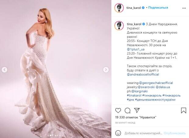 Необычный фасон, белоснежная полупрозрачная отделка, разные элементы асимметрии и пышные дополнения из другой белоснежной ткани на бедрах преобразили певицу. «С Днем Рождения, Украина! Смотрим концерты и празднуем вместе! Скоро концерт ко Дню Независимости. 30 лет. После главный концерт года ко Дню Независимости» - пишет Кароль. Поклонники поддержали: «очень красиво