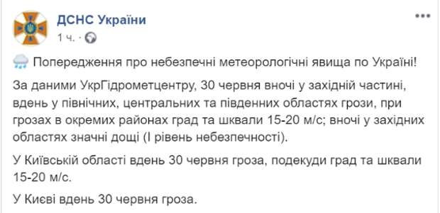 В Украине объявили I уровень опасности из-за непогоды, которая накроет все области страны 30 июня. Синоптики прогнозируют грозы, град и штормовой ветер. Об этом сообщает Государственная служба по чрезвычайным ситуациям (ГСЧС) на странице в Facebook. «30 июня ночью в западной части, днем в северных, центральных и южных областях — грозы, при грозах в отдельных районах град и шквалы 15-20 м/с.