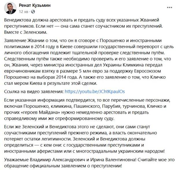 Если нет — она сама станет соучастником их преступлений. Вместе с Зеленским. Заявление Жвании о том, что он в сговоре с Порошенко и иностранными политиками в 2014 году в Киеве совершили государственный переворот с цель личного обогащения подлежит тщательной проверке следственным путём. Следственным путём также необходимо проверить и его заявление о том, что он, Жвания, через министра иностранных дел Украины Климкина передал еврочиновникам взятку в размере 5 млн евро за поддержку Евросоюзом Порошенко на выборах 2014 года. А также его заявление о том, что Кличко стал мером Киева в результате этой сделки. Ссылка на видео заявления: Если указанная информация подтвердится, то все перечисленные персонажи, включая Порошенко, климкина, Пашинского, Парубия, турчинова, Кличко и прочих «героев Майдана» нужно немедленно арестовать и предать справедливому ими же отреформированному суду. Если же Зеленский и Венедиктова этого не сделают, они сами станут соучастниками преступлений прежнего режима, а власть окончательно потеряет остатки легитимности. Зеленский и Венедиктова должны определиться — с кем они: с государственными преступниками и иностранными аферистами или с многострадальным украинским народом! Уважаемые Владимир Александрович и Ирина Валентиновна! Считайте мое это обращение официальным заявлением о преступлении! Ренат Кузьмин, украинский политик и юрист