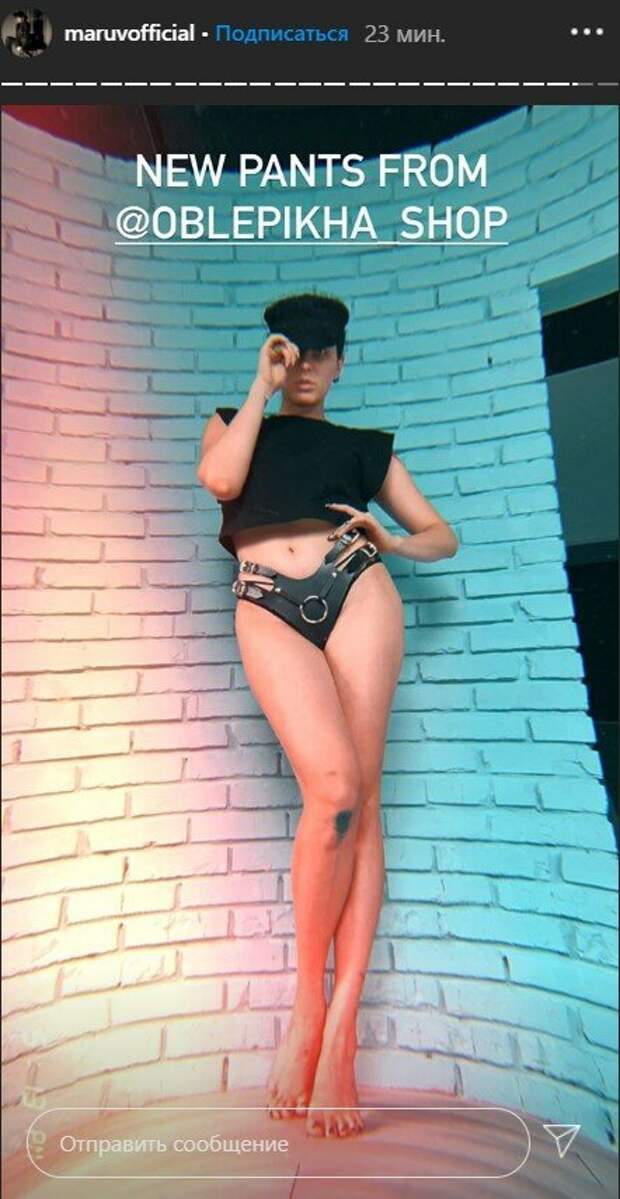 При этом ракурс фото такой, что и без того длинные ноги артистки кажутся еще длиннее, а она в очереднйо раз подчеркнула звание королевы эпатажа. Что по поводу такого вида думают фанаты певицы, неизвестно, поскольку функции комментирования тут нет. Однако, не приходится сомневаться, что публика не осталась равнодушна. Ранее мы рассказывали о том, что MARUV восхитила красотой во время съемок нового шоу. Она предстала в весьма экстравагантном образе, в котором соединили самые яркие элементы. На ней была кофта в сеточку, под которую она не стала надевать белье. На голове звезды красовалась кожаная пилотка, а на шее чокер. Сверху MARUV набросила леопардовый пиджак, который застегивался лишь на одну пуговицу, создав нереально глубокое декольте. MARUV сообщила, что станет участницей шоу «Маскарад», которое стартует на «1+1» этой осенью. Она попала в команду Дмитрия Монатика. Кроме MARUV в шоу примут участие Потап, Наталья Могилевская и Влад Яма. Напомним, что раскованная MARUV распахнула халатик, сверкнув фигурой в мини-ночнушке: фото обольстительницы. Как сообщала Politeka, MARUV без стыда распахнула халат и свела с ума образом ночной жрицы: "Учитесь, девочки, как надо...". Также Politeka писала, что бесстыжая MARUV потрясла "булочками" в рваных колготках перед концертом: "Что за рука прямо на. .."