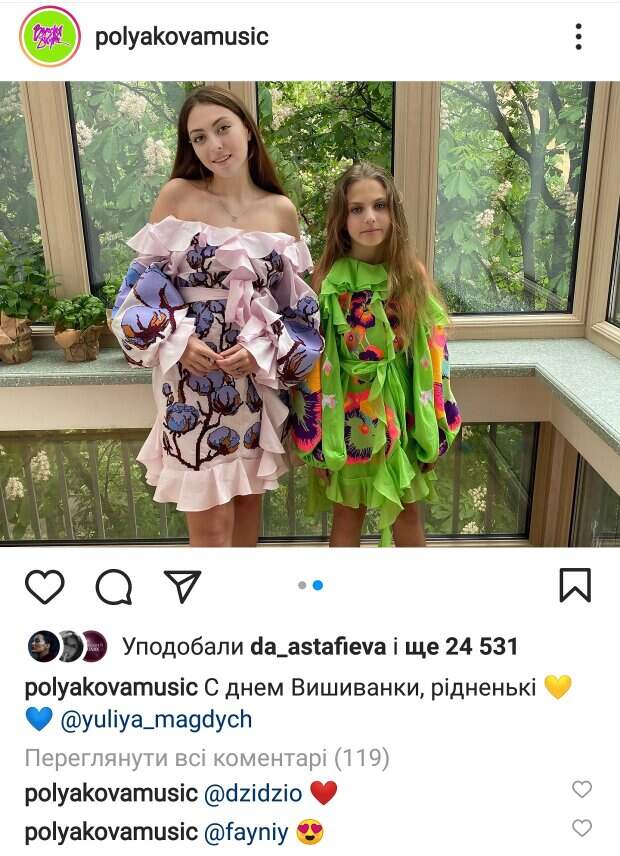 А младшая – Алиса позировала в салатовом платье с крупными яркими цветами. Фотографии произвели настоящий фурор. Полякову и ее дочек щедро засыпали комплиментами. «Какие красавицы!! Всё такие разные, но такие яркие и красивые», «Такие яркие наряды, супер! Люблю ваш позитив», «Какие куколки», «Красотки», «младшая дочь похожа на Орнелу Мути в молодости», «Младшая , конечно, красотка», «Ух ты, какие вы красавицы», «Очень красивые платья», "Ох и глаза у младшенькой класные. Будет сводить парней с ума", - пишут в комментариях. Не смог пройти мимо даже певец Дзидзьо. «Красотки», - написал он. Недавно Полякова с дочками и мамой отдыхала в Турции. «Наша банда! Я никогда не отдыхала в девичьей компании, ни с подругами, ни даже с друзьями, только с семьей...Этот отдых тоже с семьей, но вместо мужа мама, которую я не видела почти год из-за локдауна», - рассказывала певица. Напомним, Полякова после застолий и Турции оказалась в клинике вместе с мамой: "Злючая была, как собака...". Как сообщала Politeka, Полякова выложила неизвестные подробности конфликта с Кароль: "Тина всегда была…" Также Politeka писала, Потап, оставив Каменских в Мексике, "подкатил" к Поляковой: "Мне так приятно...".