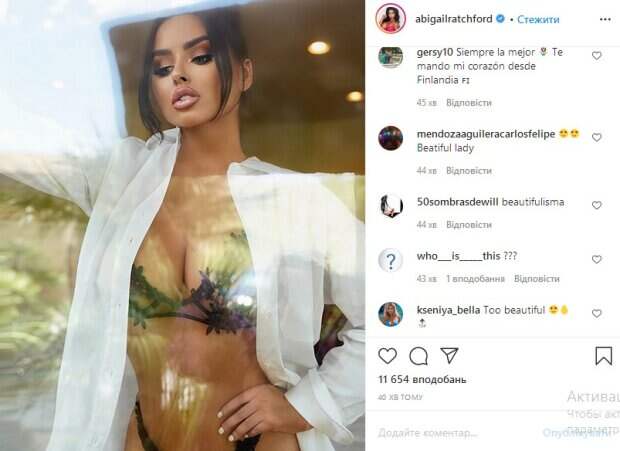 Поклонники знаменитости пришли в настоящий восторг. «Это фантастика!», «Аж дар речи отбирает», «внеземная просто», «ты очень милая и сексуальная! Круто», «кажется, там очень и очень жарко», «наряд - бомба», «очень красиво получилось», «Эбигейл, ты ангел», «красота в простоте! И ты это опять доказала», «Это слишком красиво для меня», - пишут ее поклонники. До этого сообщалось, что одна из самых высокооплачиваемых моделей белья и купальников Эби Рэтчфорд похвасталась фигурой в соблазнительном купальнике. Модель стала популярной благодаря Instagram. Там на нее обратили внимание именитые модельеры-дизайнеры купальников и белья, которые предложили ей работу. Девушка часто предстает перед поклонниками в ярких, а порой слишком откровенных нарядах, которые идеально подчеркивают ее выдающиеся формы. Несколько часов назад она решила порадовать своих поклонников новым откровенным снимком. Напомним, Эби Рэтчфорд в чулках и белье выгнулась и показала нереальные размеры. Также Politeka писала, что раскованная Эби Рэтчфорд еле удержала свое богатство в микро-бикини. А еще Politeka сообщала, что пышногрудая Эби Рэтфорд показала свои самые соблазнительные бикини.