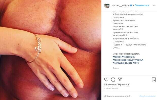 По крайней мере Тарзан был в своем стиле: эпатировать публику голыми фото ему далеко не в новинку. Глушко максимально близко заснял свой обнаженный торс: на фото видно каждую "трещинку". Стриптизер положил на живот руку с золотым браслетом в виде слова "love". Яркое фото-извинение Сергей сопроводил проникновенными стихами. Так, лирический герой вел праздную жизнь - " жил, пел, плясал- не тужил" - пока ему не плюнули в душу. Но никто не кинулся помочь "раздавленному" герою, кроме Нее. "люди, как серые мыши все моё тело грызут .... я был настолько раздавлен, повержен, думал, что ангелами отвержен, - где же вы так высоко летите?!!! - разве помочь вы мне не хотите?!!!!!! вслушиваюсь в небеса - .....тишина.... " Здесь я ",- вдруг тихо сказала ОНА..." "Моей жене посвящается", - подытожил романтически настроенный Глушко. Ранее мы сообщали, любовница Тарзана, 28-летняя краснодарская актриса Анастасия Шульженко на днях ошарашила новостью: девушка вознамерилась попытать счастья на певческом поприще. Пользователи тут же накинулись на нее, мол, не только мужа увела у Королевой, но еще и решила переплюнуть в таланте. "Ничего, когда нибудь и у тебя мужика уведут. Потом поймёшь какого это рушить чужую семью. Тарзан не лучше, но и ты убогая. Ты и мезинца Королёвой не стоишь. Песни наверное страдальческие решила петь