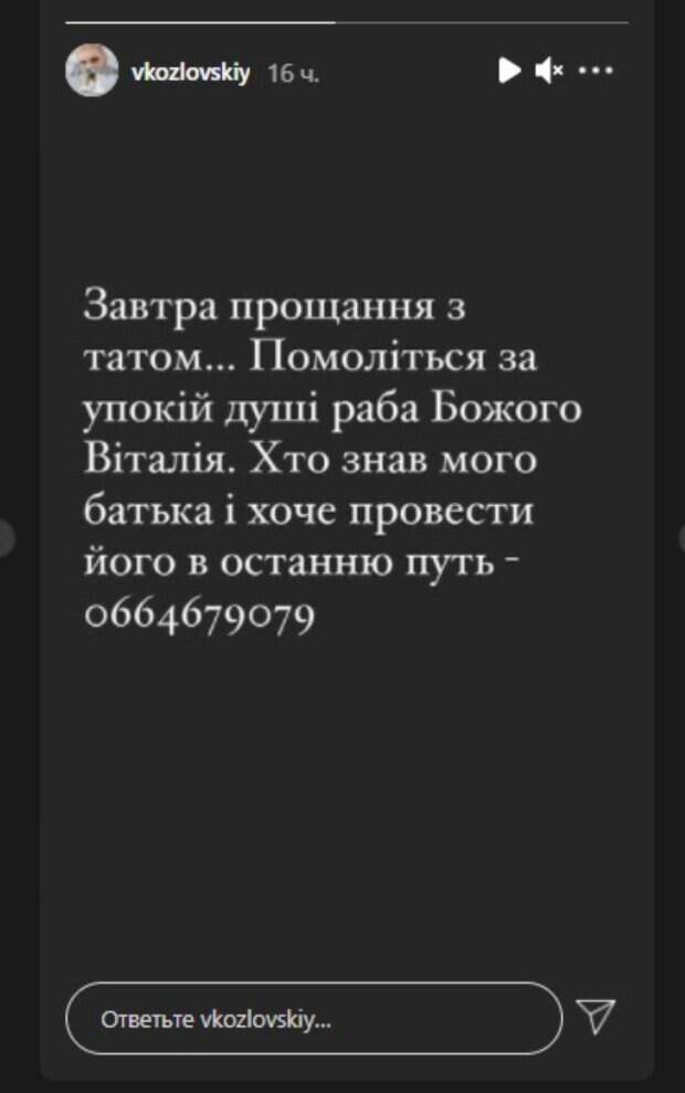 .. (номер телефона, - ред.)". Напомним, Виталий Козловский-старший скончался 15 августа на 75 году жизни. Его сын сделал щемящий пост, совроводив серией ярких фото. В частности, на некоторых снимках певец предстал совсем крохой на руках у еще молодого папы. Также Козловский поделился кадрами с последнего дня рождения отца. Последний задул свечи и поблагодарил свою семью за то, что они рядом. Последний год выдался трудным для Виталия Сергеевича. Его здоровье значительно пошатнулось после перенесенного коронавируса, и в конце концов сердце не выдержало. Коллеги Козловского, а также обычные украинцы кинулись ему соболезновать. Так, слова поддержки выказали актриса Ольга Сумская, певицы Алина Гросу, Виктория Смеюха, Светлана Тарабарова, Ольга Цибульская и другие. "Боже, Виталичек... Какая печальная новость... Глубокие соболезнования... Наш Виталий Сергеевич...