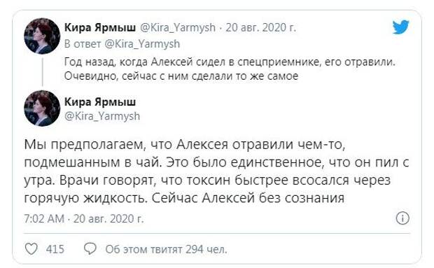 По словам пресс-секретаря, у Навального него подозрение на токсическое отравление. Ярмыш добавила, что Навалльного могли отравить через чай — это единственное, что он пил с утра. Сейчас политик в реанимации, он без сознания.