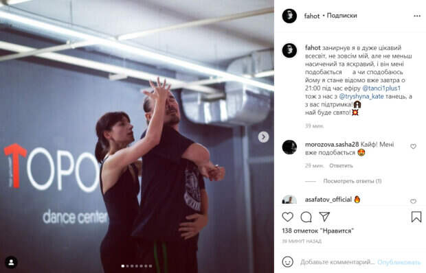 Недавно певец объявил о том, что он стал новым участником шоу "Танці з зірками". До этого артист уже выходил на паркет, однако это было более 10 лет назад. Фагот активно ведет социальные сети, где делится с поклонниками моментами из жизни. Так, на этот раз Фагот опубликовал новую серию фотографий на своей странице в Инстаграм. Как известно, его партнершей стала известная танцовщица и хореограф Екатерина Тришина. На первом эфире они станцевали танец "фокстрот", после чего выяснилось, что у пары ранее были романтические отношения.  На кадрах артист показывает, как чувственно проходят их тренировки перед эфиром. "Занырнул я в очень интересную вселенную, не совсем мою, но не менее насыщенную и яркую. и она мне нравится а понравлюсь ей я или нет станет известно уже завтра в 21:00 в эфире поэтому с нас танец, а с вас поддержка! пусть будет праздник!", поделился Фагот. Поклонники оставили несколько комментариев под фото: "Кайф, мне уже нравится". Ранее сообщалось, известный певец признался в романе со своей партнершей по "Танцям з зірками": "Не скрываю этого" Также, Горбунов объявил имена всех партнеров звездных участников "Танців з зірками": будет ли Дмитрий Дикусар Politeka рассказывала, Фагот и Артур Логай впервые засветили своих партнерш-красоток на "Танцях з зірками": "Точно вас удивит"