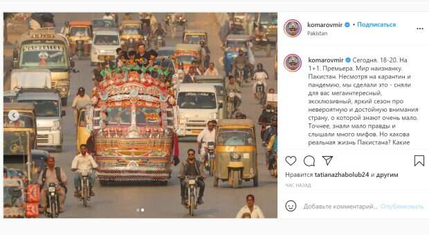net. Дмитрий Комаров в жажде снять новый увлекательный сезон своей передачи о путешествиях, остановил свой выбор на загадочном для многих Пакистане. Шоумен признался, что ему удалось развеять множество мифов об этой стране и узнать больше правды. Комаров опубликовал яркие снимки, сделанные во время путешествия, где он, полных позитивных эмоций, позировал вместе с местными жителями в раскрашенном всеми цветами радуги открытом автобусе. Такой транспорт сильно выделялся на фоне остальных транспортных средств и привлекал внимание национальной символикой. На снимке Дима Комаров позирует перед камерой, показывая большой палец вверх. При этом ведущий радостно улыбается, хотя среди других пассажиров автобуса можно заметить мужчин с огнестрельным оружием в руках и детей. Но, видимо, бесстрашный Дмитрий Комаров нашел общий язык с этими людьми. "Я впервые долго работаю и живу в такой консервативной мусульманской стране. И лично я очень рад, что выбрал именно Пакистан, открыв для себя очень много нового, многому научившись, многое поняв и переосмыслив",- пишет о своем путешествии Дмитрий Комаров. Посмотреть эту публикацию в Instagram Публикация от Дмитрий Комаров (@komarovmir) Но неожиданно среди комментариев к публикации появилась фраза его супруги - модели Александры Кучеренко. Красавица написала о схожести семейного уклада в Пакистане и в Украине. "В Украине, как и в Пакистане, мужа слушаются",- отметила Кучеренко, невольно выдав тайны семейного уклада. Но комментарий Александры вызвал у Дмитрия Комарова только восхищение - он ответил смайлом с сердечками вместо глаз. Напомним, молодая жена Комарова из "Мир наизнанку" поразила снимком во время прогулки: "Страшно даже представить..." Как сообщала Politeka, Санина из "Танців з зірками" и жена Комарова преподали стильный урок украинкам: "Красотки" Также Politeka писала, что Комаров из "Мир наизнанку" впечатлил Дорофееву отличной формой и признанием: "В свои 37 лет…"
