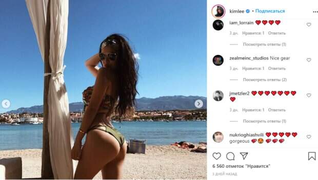 Ким Ли снимается для популярных мужских журналов, поэтому она с легкостью примеряет смелые наряды. Несмотря на это, на камеру Ли раздеваться на любит и на пляже блистает купальниками самого разного и нередко скромного дизайна. Тем не менее, пользователи положительно оценивают образы Ли ведь несмотря на минималистичные образы, фигура модели по-прежнему хороша и скрыть пышные достоинства очень трудно. Вот как реагируют в сети на фото Ли, которая надела болотного цвета бикини с цветными завязками без бретелек на бюсте: «Великолепный бикини, спасибо; Рад видеть тебя снова на отдыхе; Красиво❤️❤️; Yayyyy .. Теперь пора довести формы до совершенства ✨