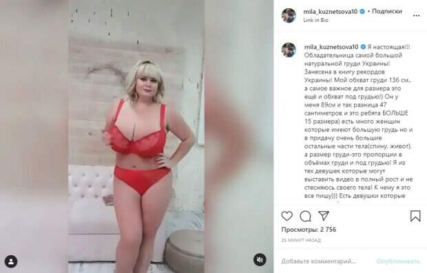 Периодически она подходит к камере совсем близко и то показывает свою великолепную грудь, то посылает фанатам воздушный поцелуй. "Я настоящая!!! Обладательница самой большой натуральной груди Украины! Занесена в книгу рекордов Украины! Мой обхват груди 136 см., а самое важное для размера это ещё и обхват под грудью!) Он у меня 89см и так разница 47 сантиметров и это ребята БОЛЬШЕ 15 размера) есть много женщин которые имеют большую грудь но и в придачу очень большие остальные части тела(спину, живот), а размер груди-это пропорции в объёмах груди и под грудью! Я из тех девушек которые могут выставить видео в полный рост и не стесняюсь своего тела! К чему я это все пишу))) Есть девушки которые настолько фотошопят свои фотографии что в реале это совершенно другой человек