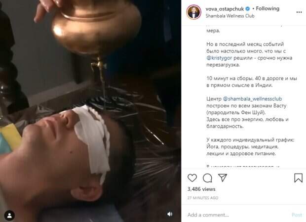 Украинский телеведущий Владимир Остапчук вместе со своей невестой Кристиной Горняк отправились оздоравливаться Как пишет Politeka.net, знаменитость разместил на своей странице в "Инстаграм" видеозапись необычных процедур (чтобы посмотреть, скрольте страницу до конца). Владимир Остапчук запечатлен лежащим на кушетке, его глаза закрыли спонжиками, а на голове - специальная белая повязка.