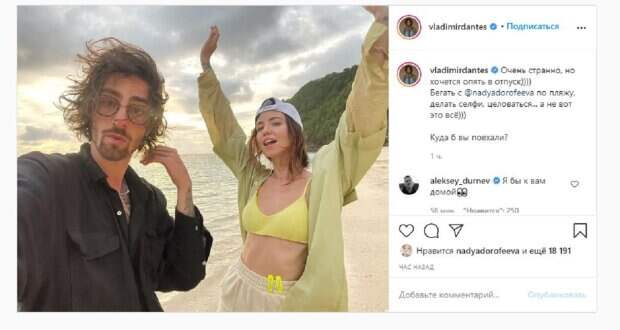 Владимир Дантес и Надя Дорофеева показали, как развлекались в отпуске На фото Надя позировала в шортах, рубашке и топике. звезда подняла руки, а голову прикрыла бейсболкой. Рядом можно увидеть Владимира, который был в рубашке и очках. Дантес снимал себя и Дорофееву на телефон, хвастаясь роскошными видами пляжа.