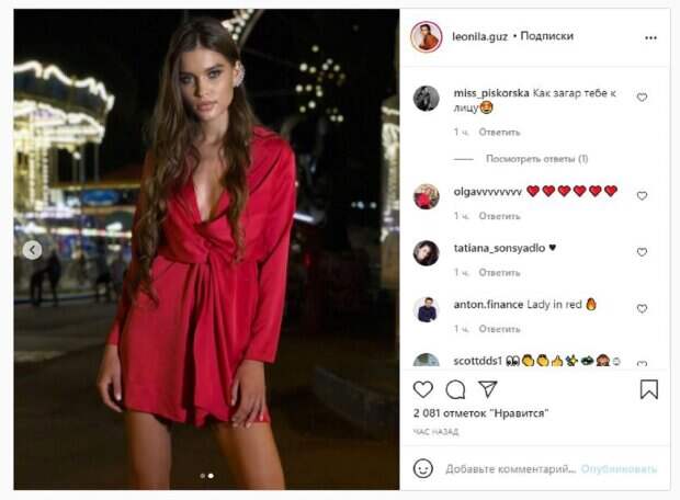 Девушка постоянно радует фанатов отчетами фотосессий, которые бывают довольно пикантными и провокационными. Так случилось и в этот раз, когда Леонила решила показать фото с ночной прогулки. Девушка надела красное платье с довольно смелым декольте, ведь можно сразу заметить, что Гузь белья не надевала. Модель позировала на фоне аттракционов, восхищая идеальной фигурой. Фанаты сразу же начали ставить тысячи лайков и писать комплименты красотке: "Как загар тебе к лицу", "Дама в красном", "Необычайная красота!", "Ты прекрасна", "Если мне нужно думать о красоте, я больше не думаю, я это вижу", "Как красиво!". Мы писали, что известная модель Леонила Гузь, "Мисс Украина 2018", умеет привлечь внимание к себе благодаря смелым образам. "Чтобы горели глаза и пела душа. Выберите приятный вид активного отдыха и уважайте свое тело. Ешьте полезную пищу, но не ограничивайте себя в любимых блюдах", - посоветовала красавица. Напомним, бесстыжая Мисс Украина Леонила Гузь заставила любоваться "бесконечными" ножками в мини А еще Politeka писала, что Мисс Украина Леонила Гузь без лифчика и штанов расставила ноги перед камерой Также Politeka сообщала, что Мисс Украина Леонила Гузь в прозрачном наряде заставила сердца биться чаще