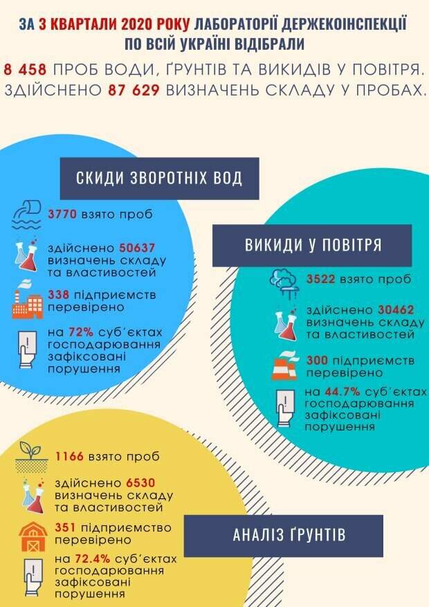 Инфографика с результатами работы лабораторий обнародована на сайте Государственной экологической инспекции. «В течение 3 кварталов 2020 года по всей Украине отобрано всего 8 458 проб вод, почв и выбросов и осуществлено 87 629 определений состава», - сообщил председатель Госэкоинспекции Андрей Малеванный, пишет "Знай".
