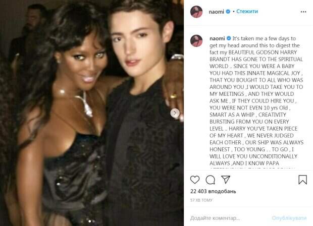 «Мне потребовалось несколько дней, чтобы осмыслить это, чтобы переварить тот факт, что мой красивый Годсон Гарри Брант оправляется в духовный мир... С тех пор как ты был младенцем, у тебя была эта врожденная магическая радость, которую ты дарил всем, кто был рядом», - написала супермодель. Кэмпбелл добавила, что всегда будет любить Гарри Брант и выразила соболезнования всей его семье. «Гарри, ты забрал часть моего сердца. Мы никогда не осуждали друг друга, всегда были искренни. Слишком молодой, чтобы уйти. Я всегда буду тебя любить. И я знаю, что папа Аззедин [близкий друг Наоми, модельер Аззедин Алайя, который скончался в 2017 году] позаботится о тебе на той стороне. Однажды мы снова встретимся, и будем радоваться. Твоя крестная