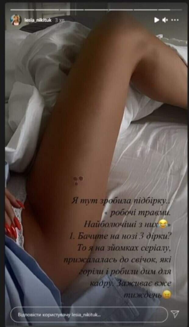Так, сейчас она лечит ожоги на ноге от свечи, которые получила на съемках сериала, а когда-то ей вообще пришлось "покататься" на инвалидном кресле после падения с горы в Норвегии. Кроме того, ее кусали москиты за самое мягкое место, что закончилось болючими уколами, и делали педикюр в Набимии, сняв лак вместе с кожей. Также Никитюк вспомнила о травме, которую получила на первом эфире шоу "Танці з зірками" в 2018 году. Тогда пара Леси и хореографа Максима Ежова получила 18 баллов от судей. Члены жюри были не в восторге от танца Леси, зато именно ее номер стал самым просматриваемым на ютуб-канале проекта. Позднее выяснилось, что ведущая повредила тогда локоть и сразу после оглашения результатов поехала в травмпункт, где ей сделали рентген. Врач диагностировал ушиб и прописал три дня ходить в повязке. Леся поделилась архивным кадром, как Ежов держит ее, раненую, на руках, но что-то пошло не по плану. "Я не понимаю, почему Инстаграм-общество удалило мое фото в сториз, где я рассказываю о травме руки на "Танцях з зірками"... я на руках у Макса Ежова. Возможно, они подумали, что если он афроамериканец, то обидел меня и я это выставляю?.." Ранее сообщалось, Никитюк показала лицо крупным планом, похваставшись нюдовым макияжем: "Как херабора" Также, Леся Никитюк получила жуткие травмы на съемках, появились кадры: "Самые больные. .." Politeka рассказывала, Никитюк в экстра-мини и ботфортах впечатлила видом: "Как похожа на любимую Повалий"
