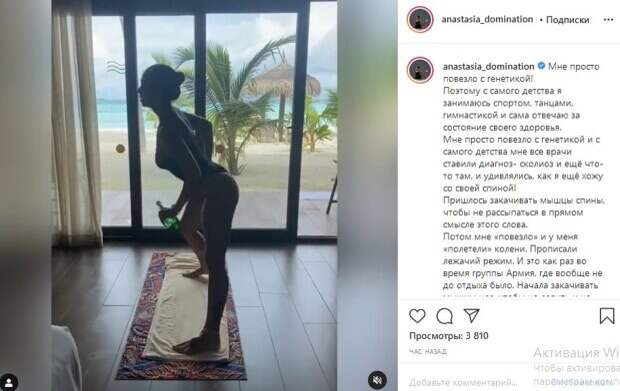 Мне просто повезло с генетикой и с самого детства мне все врачи ставили диагноз - сколиоз и ещё что-то там, и удивлялись, как я ещё хожу со своей спиной! Пришлось закачивать мышцы спины, чтобы не рассыпаться в прямом смысле этого слова» - говорится в сообщении. После этого, по словам Кумейко, ей «повезло» и у нее начались проблемы с коленями. «Прописали лежачий режим. И это как раз во время группы Армия, где вообще не до отдыха было. Начала закачивать мышцы ног, чтобы не ловить и не вставлять на место коленную чашечку. Из последних «повезло» у меня надрыв связки в грудном отделе спины...» - рассказала звезда. Однако ей повезло, рассказала Dj Nana, с силой воли и желанием быть собой и быть здоровой. «Между сильным желанием достичь успеха и самим успехом существует прямая связь, если применить немного усилий. И через какое-то время вы станете еще лучше», - уточнила певица. Обратим внимание, что на опубликованных кадрах Кумейко показывает в одном боди, как тренируется на отдыхе. "Вау, кошечка", - пишут ее поклонники. Напомним, экс-Nikita завлекла самыми пикантными изгибами в мини-бикини, будоражащие кадры Также Politeka писала, что раздетая экс-Nikita пленила изгибами, сбросив лишнюю одежду Также Politeka сообщала, что страстная экс-Nikita Кумейко покорила изгибами во время танца, оставшись в одном белье