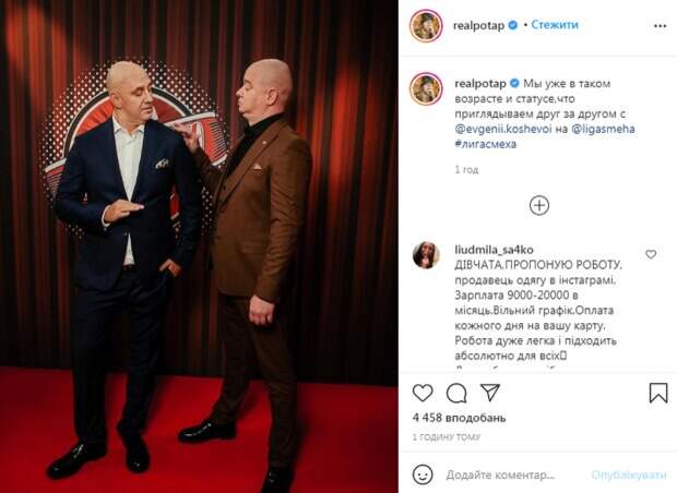 koshevoi на @ligasmeha", - говорится в сообщении. На новом фото артисты выглядят довольно солидно - они одеты в костюмы и позируют с очень серьезным выражением лица. На Потапе можно увидеть белую рубашку и темно-синий костюм, а на Кошевом - черный гольф и коричневый костюм. "Потап рулит", "Настоящие мужчины", "Класс, вы крутые", "Вы такие Биба и Боба на "Лиге смеха", "В каком таком возрасте? Сейчас вот обидно было за возраст", "В каком таком? Ну вообще", - пишут в комментариях. Следует отметить, что поклонники Потапа всегда мгновенно реагируют на новые публикации. Фото с Кошевым появилось всего час назад, но уже набрало почти 5 тысяч лайков. Кроме того, пользователи активно комментируют фото и видео, которыми Потап радует своих фолловеров. Напомним, Приемная дочь Потапа засветила роскошный особняк, пока мамы нет дома: "какая офигенная...". Как сообщала Politeka, Похудевший Потап засветил белоснежный интерьер своего дома по соседству с Горбуновым:"первая дверца для...". Также Politeka писала, Леся Никитюк положила глаз на сына Потапа, а он и не против: "взрослый уже".