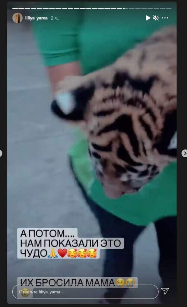 На новых кадрах Лилия Яма показала, как гуляла по зоопарку "Страус-юг" в Мелитополе. Красотка уделила много внимания тигренку, которого бросила мама, записав сторисы. "А потом нам показали это чудо. Их бросила мама. Боже, передать не могу, какие чувства меня переполняли. Я свечусь от счастья. Тигренок был не спокойный. Взяла его на руки и успокоился", - написала Лилия. "Сколько любви в этом видео. Правда????", - продолжила красотка, держа зверя на руках. Напомним, Влад Яма из «Танців з зірками» не сдержался, увидев фото жены с пляжа А еще Politeka писала, что Влад Яма из "Танців з зірками" разжег интерес кадрами с женой и новым судьей Чмерковским Также Politeka сообщала, что Влад Яма из "Танців з зірками" с женой показали, чем занимаются, пока сын в школе